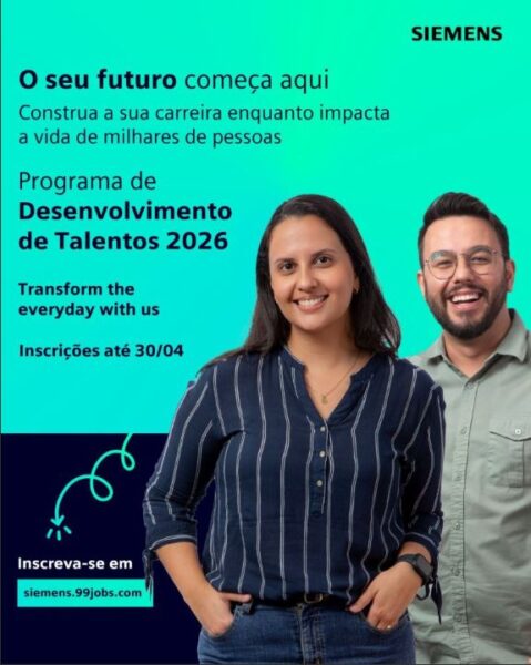 Inscrições abertas para o Programa de Estágio Siemens 2026, uma iniciativa voltada ao desenvolvimento de estudantes que desejam iniciar sua carreira em uma empresa global de tecnologia, inovação e impacto positivo na sociedade.
