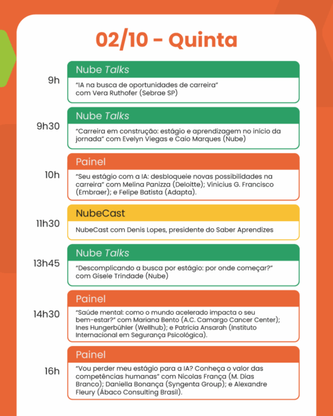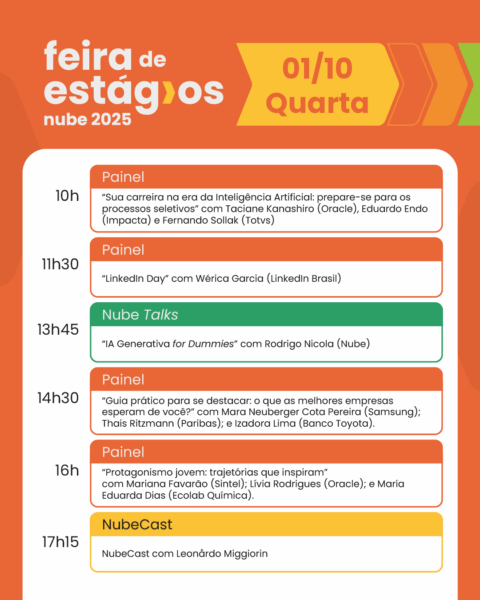 A Feira de Estágios Nube já começou! Este evento totalmente online e gratuito é a sua chance de se conectar com grandes oportunidades.